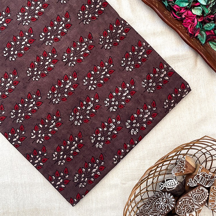 Pure Cotton Hand Block Ajrakh Printed Fabric – Leaves Butta – Brown/Red