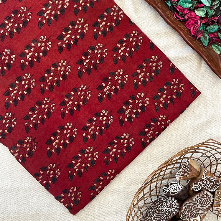 Pure Cotton Hand Block Ajrakh Printed Fabric – Leaves Butta – Red