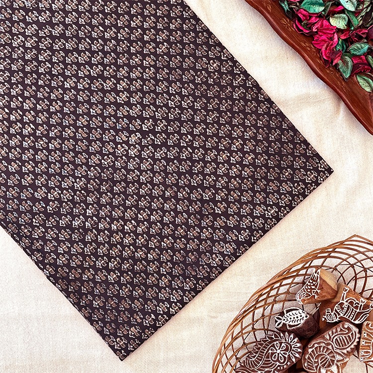 Pure Cotton Hand Block Ajrakh Printed Fabric – Small Butti – Brown